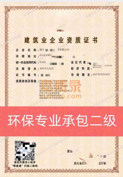 湖北省武汉市环保工程专业承包二级资质公司转让