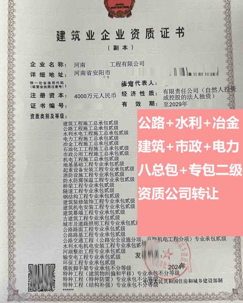 转让河南公路工程、水利工程、冶金工程施工总承包二级资质公司、八总包资质公司出售¥面议