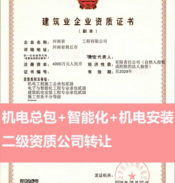 转让河南商丘市机电工程总包二级资质公司、机电工程总包资质公司代办出售¥面议