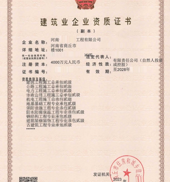 转让河南商丘建筑工程施工总承包二级资质公司、古建筑工程资质代办出售¥面议