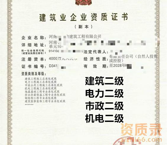 河南电力二级,机电二级,市政二级,建筑二级资质公司转让出售