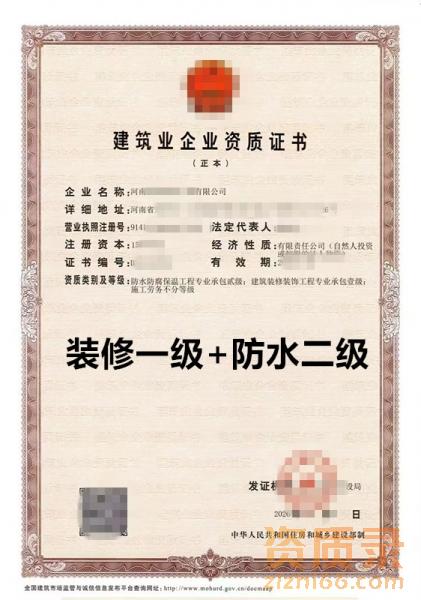 河南装修一级+防水二级资质公司出售转让