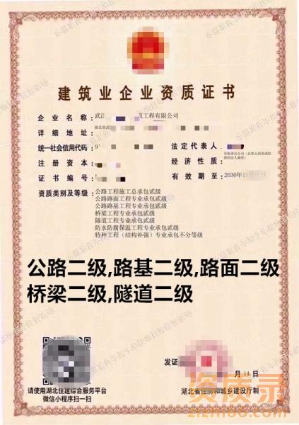 湖北公路二级,路基二级,路面二级,桥梁二级,隧道二级资质公司转让出售