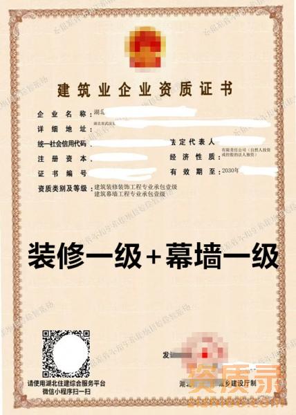 湖北建筑幕墙一级+装修一级资质公司出售转让