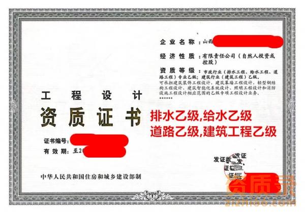 山西市政设计给水乙级,排水乙级,道路乙级,建筑工程乙级资质公司转让出售